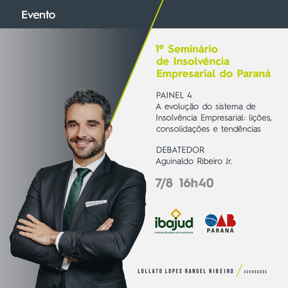 Aguinaldo Ribeiro Jr. participa amanhã, 07/08, do 1º Seminário de Insolvência Empresarial do Paraná, organizado pelo IBAJUD – Instituto Brasileiro da Insolvência e pela OAB do Paraná.