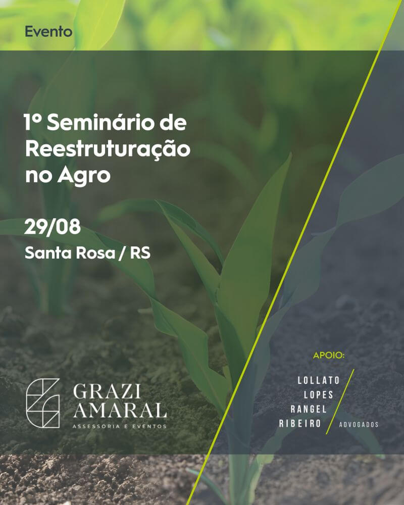 No próximo mês de agosto, a cidade de Santa Rosa, no Rio Grande do Sul, recebe o 1º Seminário de Reestruturação no Agro. O encontro, que será realizado no dia 29/08, conta com o apoio de Lollato Lopes Rangel Ribeiro Advogados.