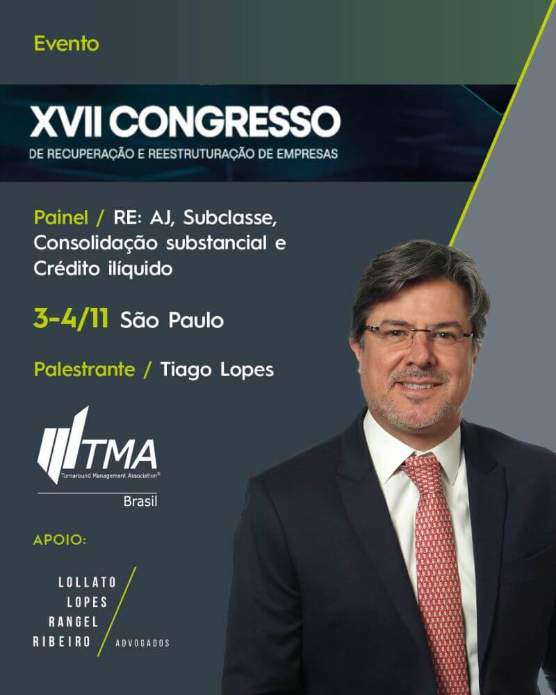 Promovida pela Turnaround Management Association do Brasil (TMA Brasil), a sétima edição do evento conta com o apoio do Lollato Lopes Rangel Ribeiro Advogados.